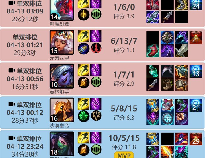 04月14日讯 LPL季后赛败者组决赛TESvsJDG的比赛将在下午开战,根据韩服排位小程序显示,TES中单Creme在赛前练习了薇古丝、永恩、奇亚娜等英雄,但排位效果不佳。