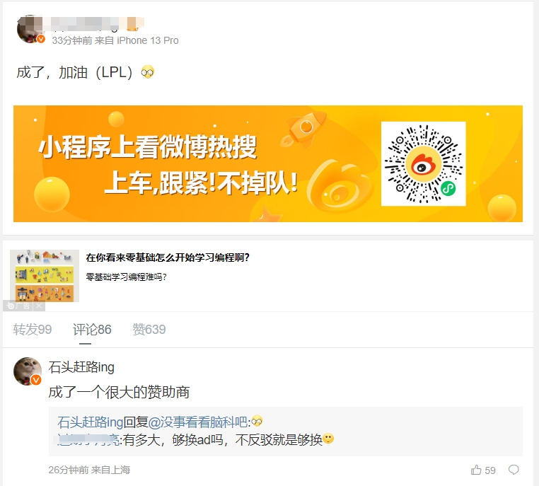4月20日讯 今日WBG老板石头赶路突然发博,附文:成了,LPL加油!随后其也是在评论区补充道:成了一个很大的赞助商(谜语),有网友猜测疑似和沙特石油杯有关。