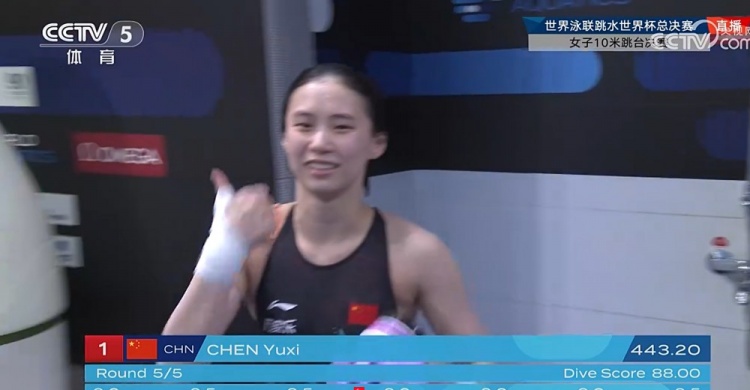 4月21日讯 在刚刚结束的西安跳水世界杯女子10米台决赛中,陈芋汐凭借443.2分拿到冠军,另一位中国选手全红婵第4跳出现比较明显的失误最终410.7分,排名第2。