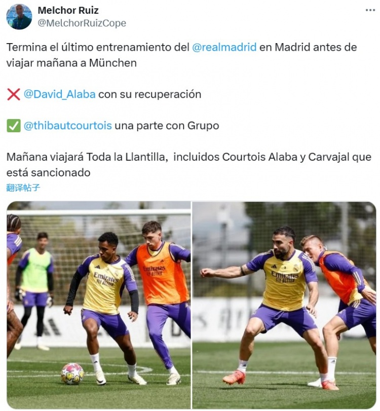 皇马全队将在明天飞赴慕尼黑,包括有伤在身的阿拉巴、库尔图瓦,以及停赛的卡瓦哈尔。