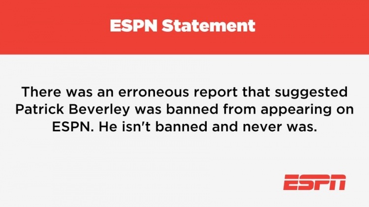 不过ESPN今日对此进行了辟谣,他们在一份声明中写道:“有不实的报道称ESPN封杀了贝弗利。他没有被封杀,也从来没有被封杀过。”