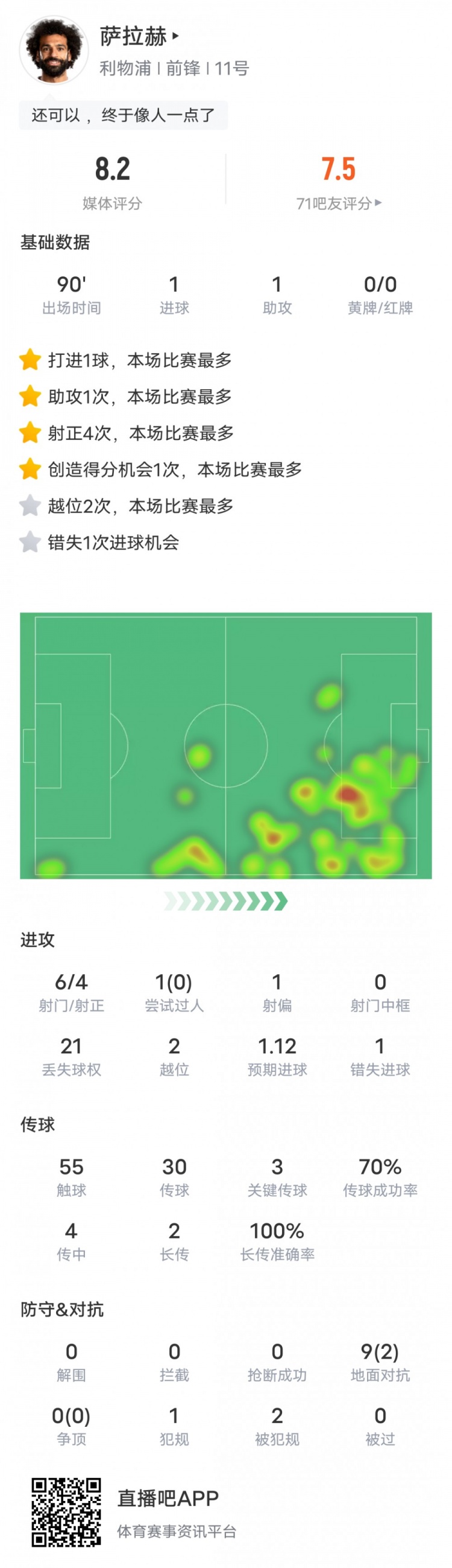 萨拉赫本场数据:传射建功+3关键传球&错失1次进球机会,评分8.2