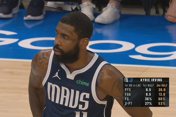 第一轮对阵快船,欧文上半场场均出手6.5次,得到6.5分,命中率36%,三分命中率27%;下半场场均出手12次,得到20分,命中率60%,三分命中率53%。