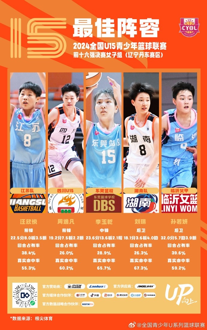 全国U15青少年篮球联赛前十六强决赛女子组最佳阵容公布。
