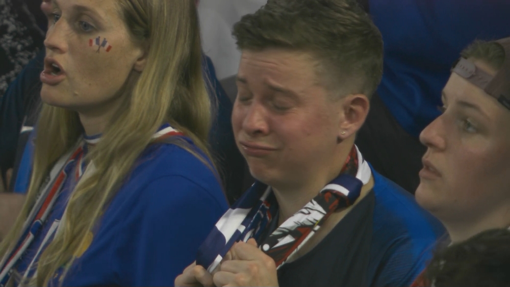 比赛即将结束时,转播镜头给到看台的法国球迷,有的捂脸,有的抱头,有的闭眼嘟嘴。