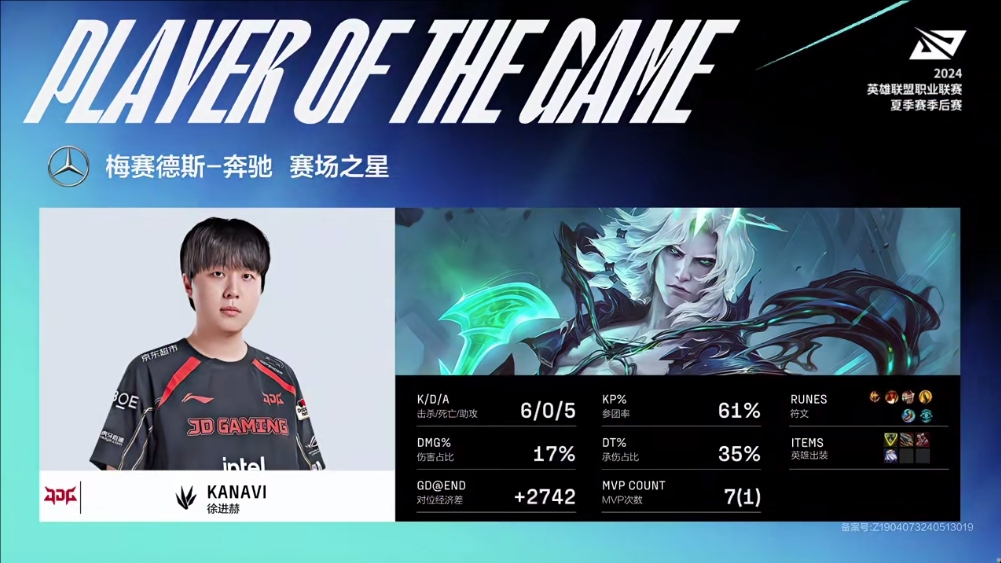 8月12日宣 LPL夏季赛季后赛第二局JDG击败NIP,Kanavi凭借佛耶戈的亮眼表现斩获对局MVP。