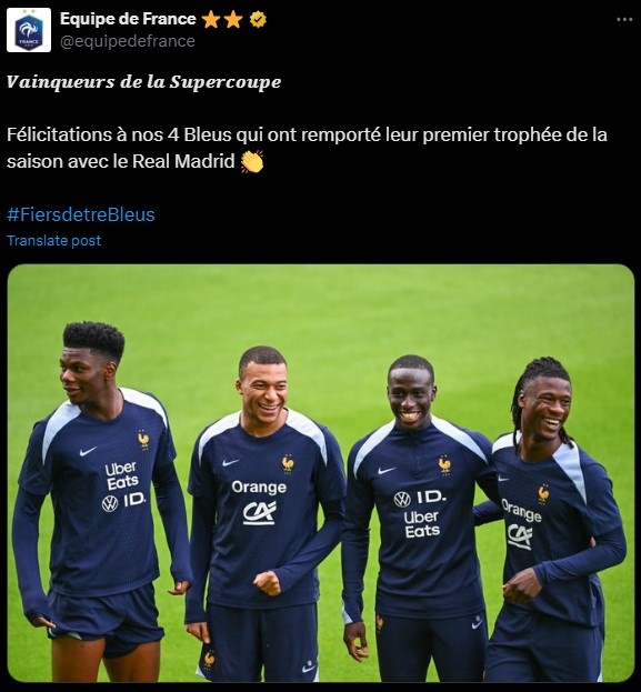 法国官推写道:“超级杯冠军,祝贺我们的四位法国球员随皇马赢得赛季首座冠军!”