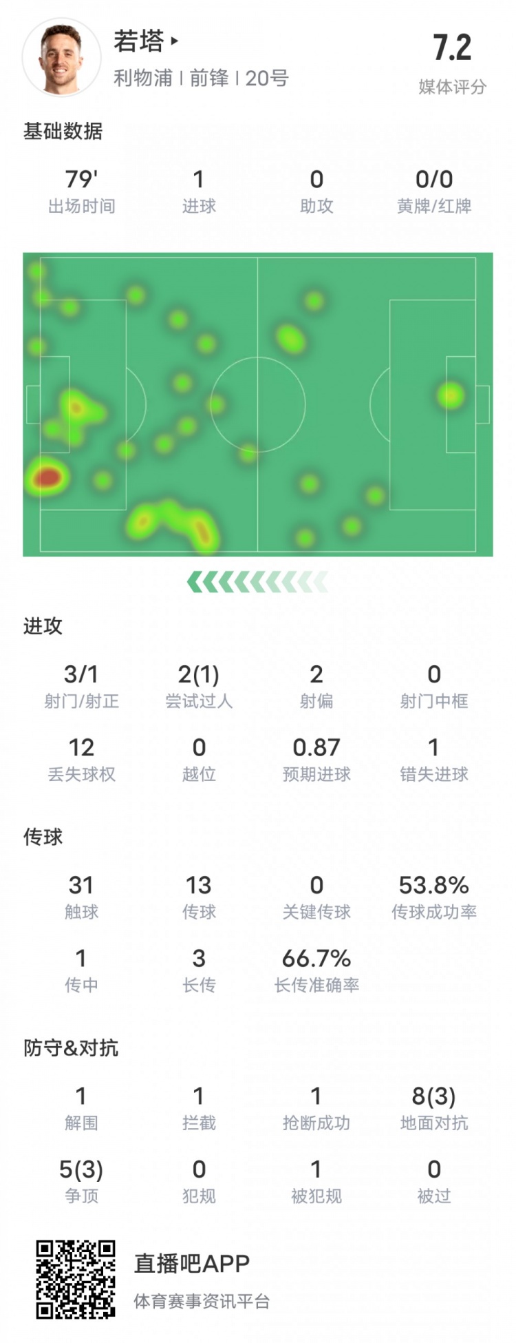 若塔本场比赛数据:1进球1过人成功&错失1次进球机会,评分7.2