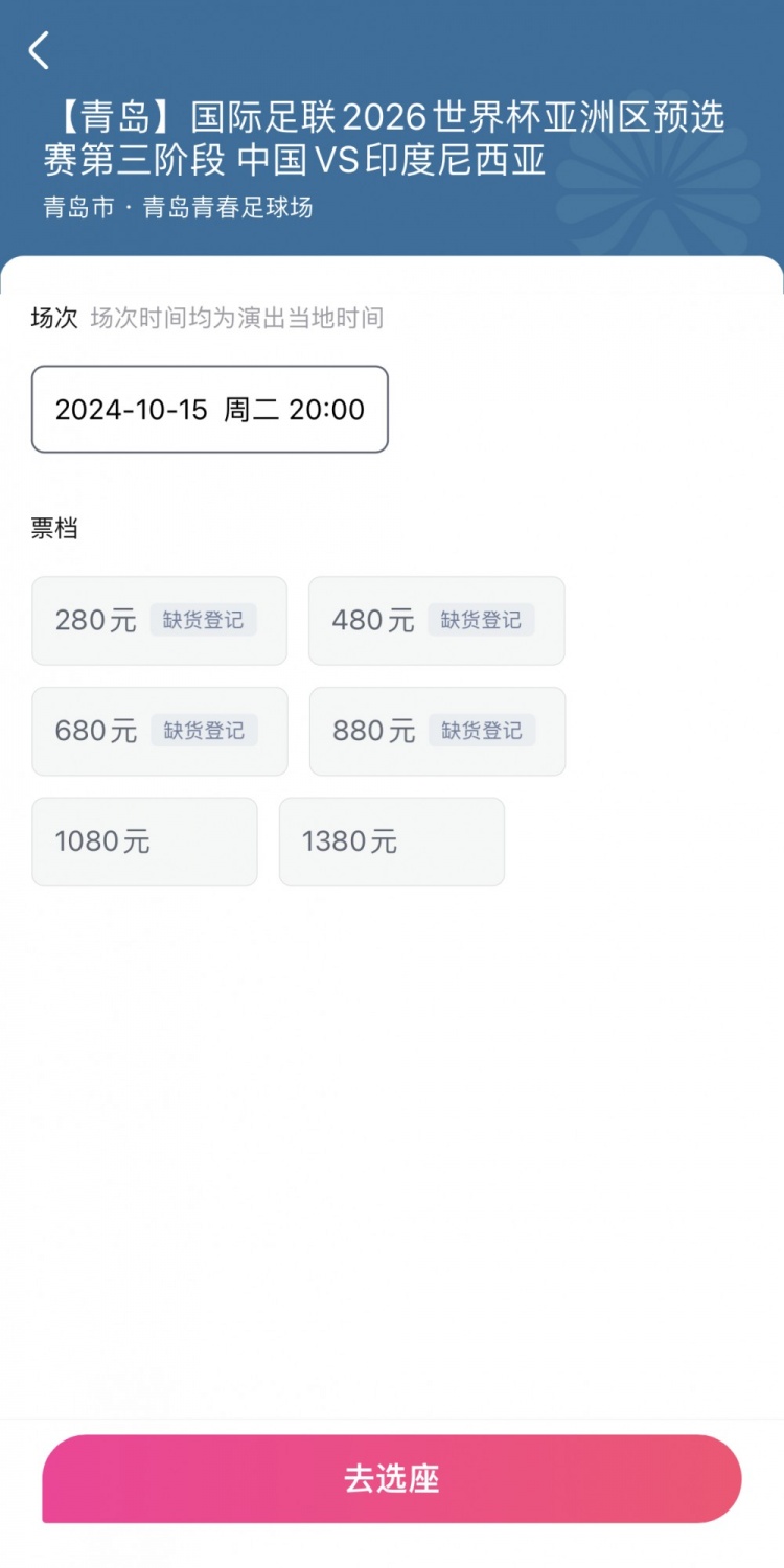 本场比赛的票务总代理处显示,从280元至880元的四档票价目前显示缺货状态。不过与此同时,1080元和1380元这两档最高价格的门票还在销售状态中。其中1080元档仍有大量余票,而1380元档由于整体可售票座位较少,目前余票已不多。