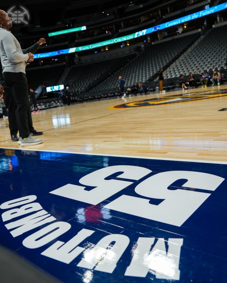 为纪念已故掘金名宿迪坎贝-穆托姆博,掘金在其主场地板上添加了穆托姆博的元素(如新闻配图所示),其中包括其姓氏“Mutombo”与球衣号码“55”。