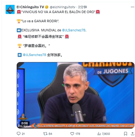 六台是继法国媒体RMC之后,今天第二家宣称维尼修斯不会夺得本届金球奖的媒体。