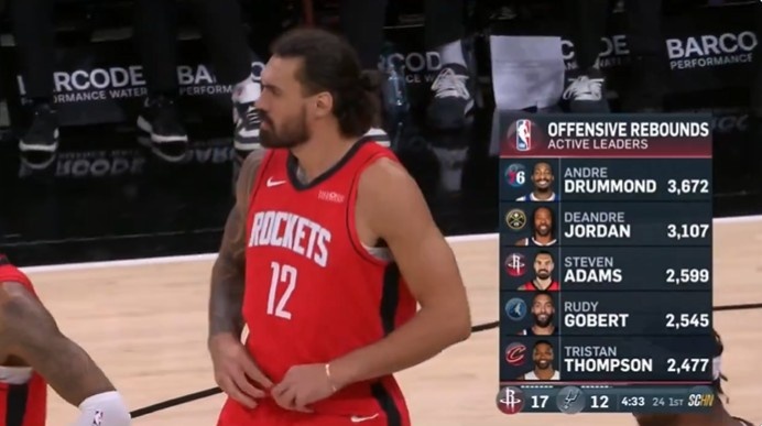 亚当斯迎火箭首秀!他生涯至今揽下2599前场板排名现役第3!