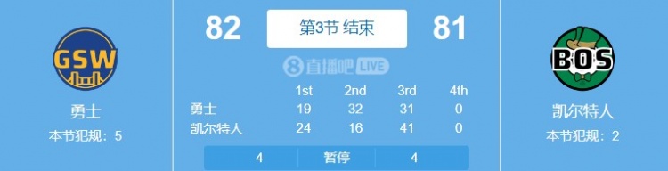 11月7日讯 NBA常规赛,凯尔特人在第三节结束时以81-82落后勇士1分。