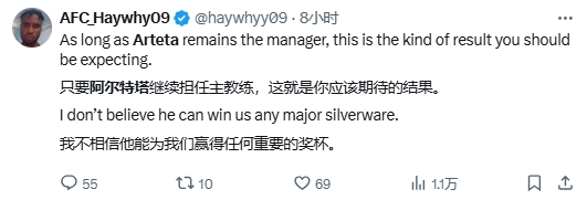 比赛结束后,球迷再次爆发,又一次在社媒怒斥阿尔特塔。