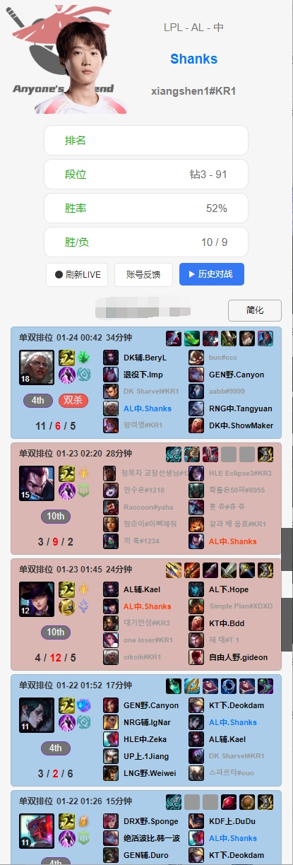 AL队内选手近期韩服Rank胜率均超过50%,圣枪哥连续数据使用不同的上单英雄,Tarzan和Kael近期状态极佳Rank胜利超过60%。