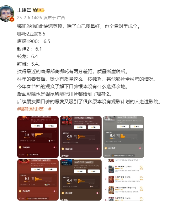 对此体坛周报记者王玮晨对于此事提出了自己的看法,他认为哪吒2能如此快速登顶,除了自己质量好,剩下就靠对手成全。