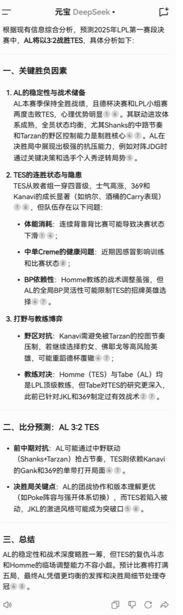 2月27日宣 今日LPL败者组TES以3-1击败对手JDG挺进决赛将交手JDG,对此DeepSeek作出自己预测,TES因为连续比赛体能下滑,Creme健康问题,以及哥哥激进的风格,很可能2-3落败!