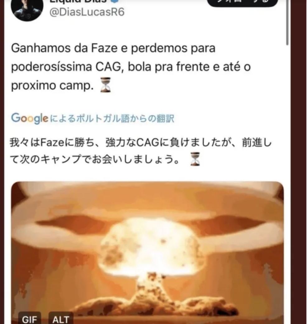 5月19日宣 在不久前进行的彩虹六号比赛中,Liquid战队选手Dias在输给日本战队CAG之后发布一张广岛原子弹核爆的GIF,并配文到“我们赢下了FaZe但输给了"强大"的CAG,让我们继续加油下一阶段再见”而这条推特随后在日本引发巨大争议。