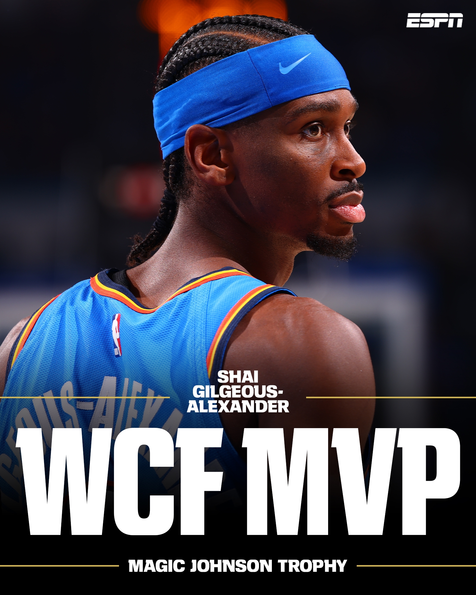 雷霆夺得西部冠军!在赛后的颁奖典礼上,新科MVP谢伊-吉尔杰斯-亚历山大荣誉单上再添新章——他拿下了西决MVP。