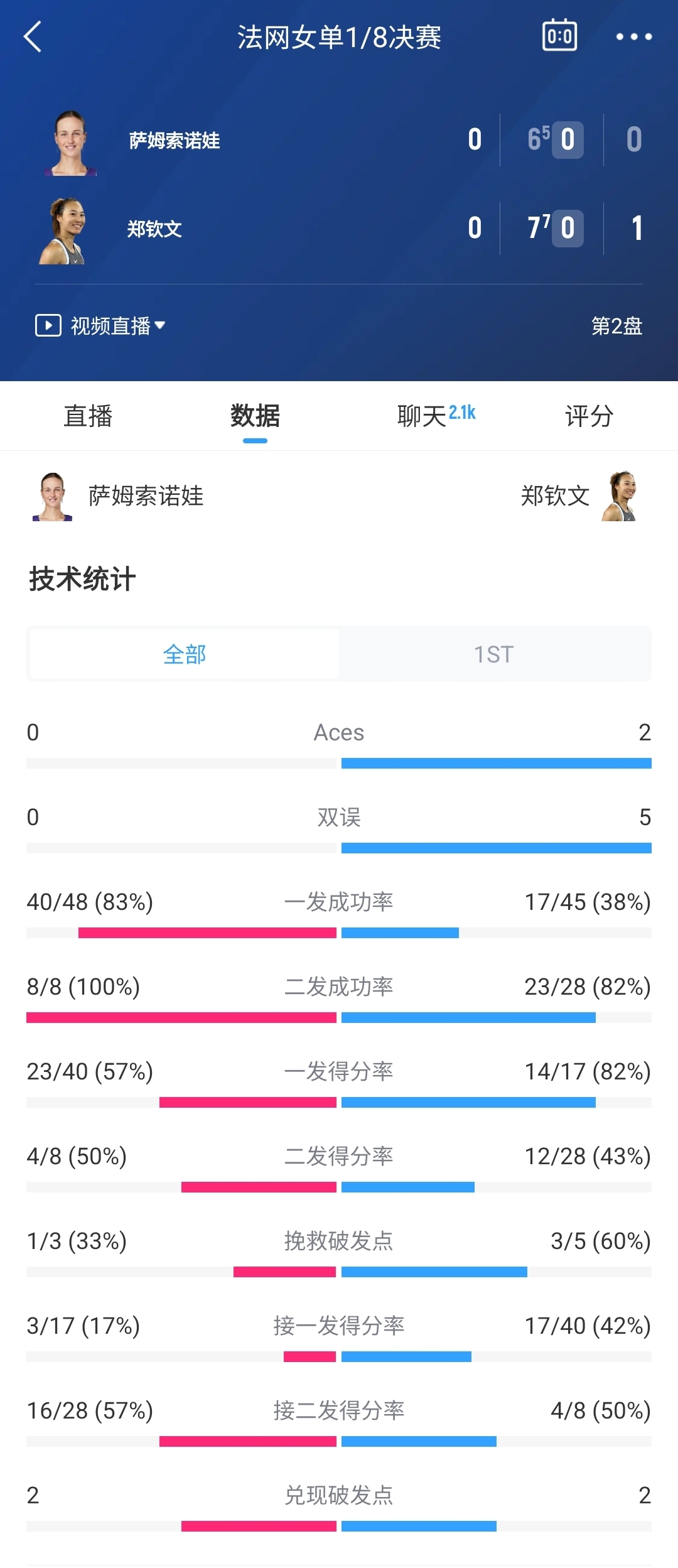 06月01日宣 法网女单1/8决赛,郑钦文vs赛会19号种子萨姆索诺娃,首盘郑钦文出现了五个双误,两度被破发随后立即回破。最终郑钦文在抢七中7-5获胜,大比分1-0领先。