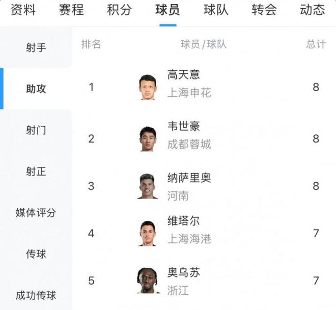 中超助攻榜:韦世豪、纳萨里奥追平高天意,8次并列榜首