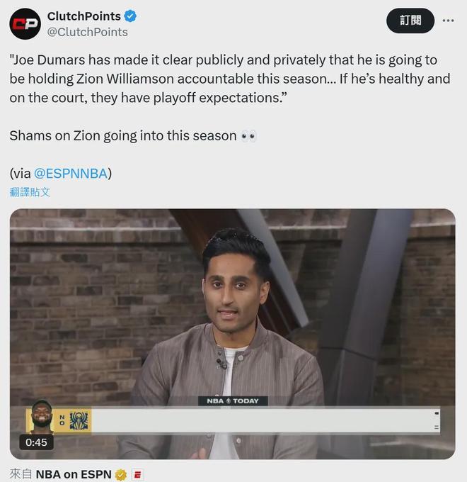 “杜马斯在公开和私下场合都曾明确表示,本赛季他将要求锡安切实承担责任,而这份责任首先体现在领导力层面——比如遵守时间安排。只要锡安能健康地驰骋赛场,球队就有冲击季后赛的希望,关键在于让他持续以健康状态稳定出战。”