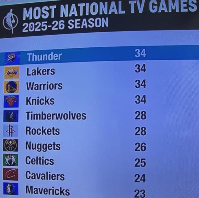 此外,大球市球队或者顶级强队也有流量倾斜,比如身处纽约的尼克斯和卫冕冠军雷霆,也各自有34场全美直播。