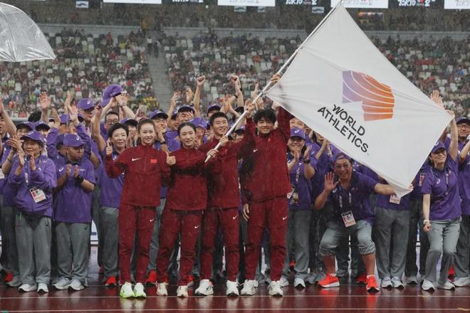 ▲闭幕式当天,中国运动员代表接过世界田联会旗