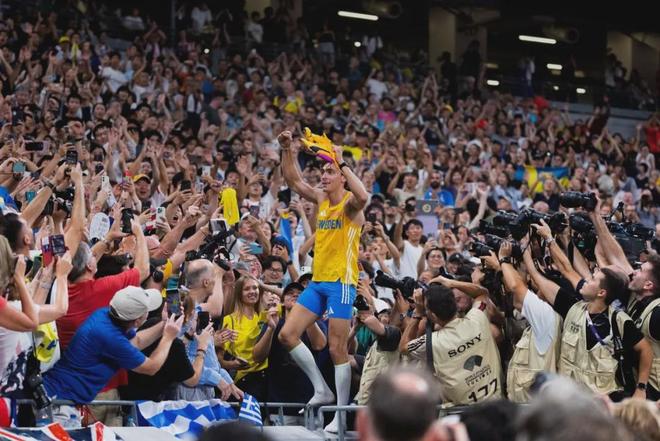 ▲杜普兰蒂斯再破世界纪录后,跳上看台与观众一起庆祝