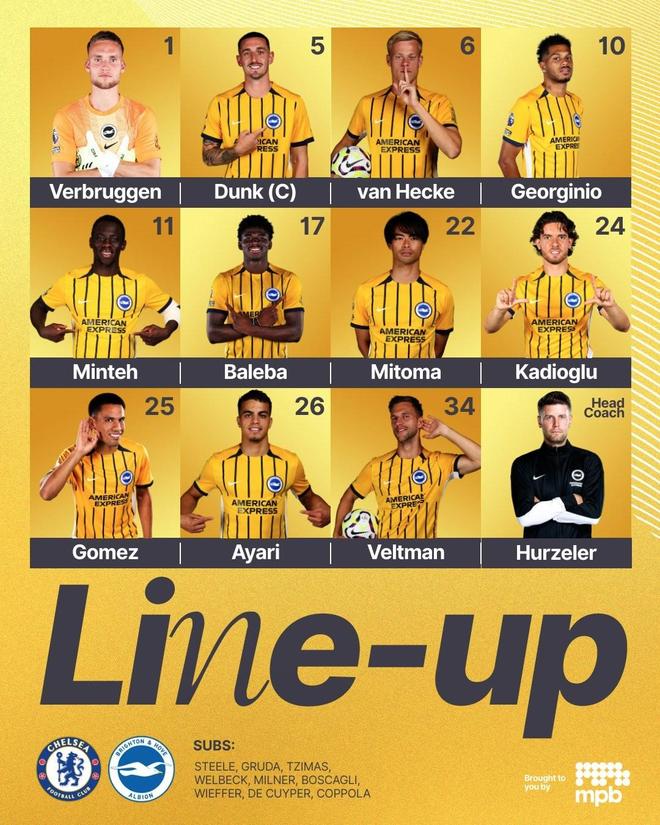 北京时间9月27日22:00,英超第6轮的一场对决。切尔西坐镇主场,迎战布莱顿。赛前,双方的阵容公布如下: