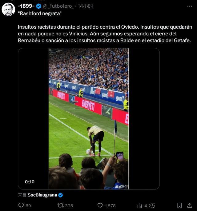 在巴萨球迷中存在一种“传言”,认为西甲主席特巴斯在处理种族主义事件时存在“双标”。比如对熊皇的事件处理得非常迅速,但这次拉什福德遭遇辱骂,是否能得到同样的重视,还有待观察。