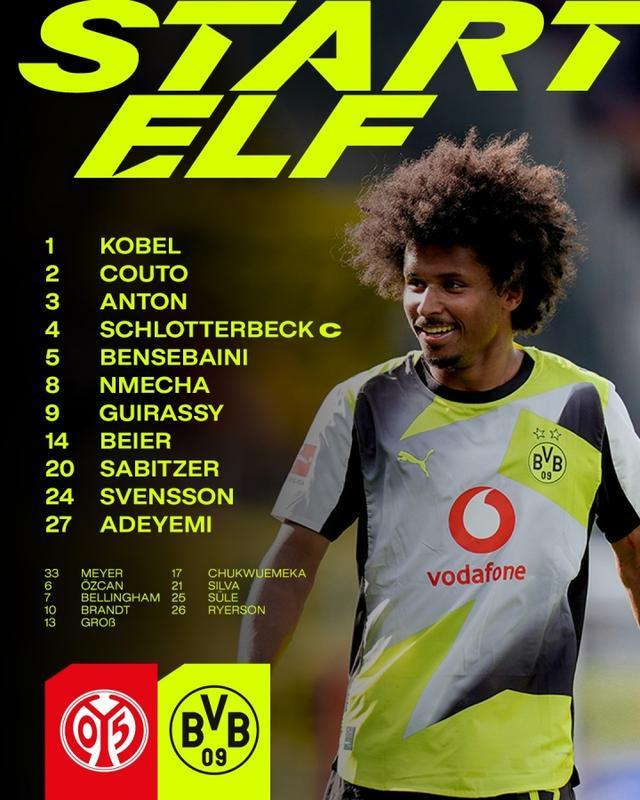 直播吧09月27日宣 德甲第5轮,多特客场挑战美因茨,双方首发名单公布,本场比赛,多特今夏的标王小贝林厄姆继续替补,这已经是他连续第四场替补。