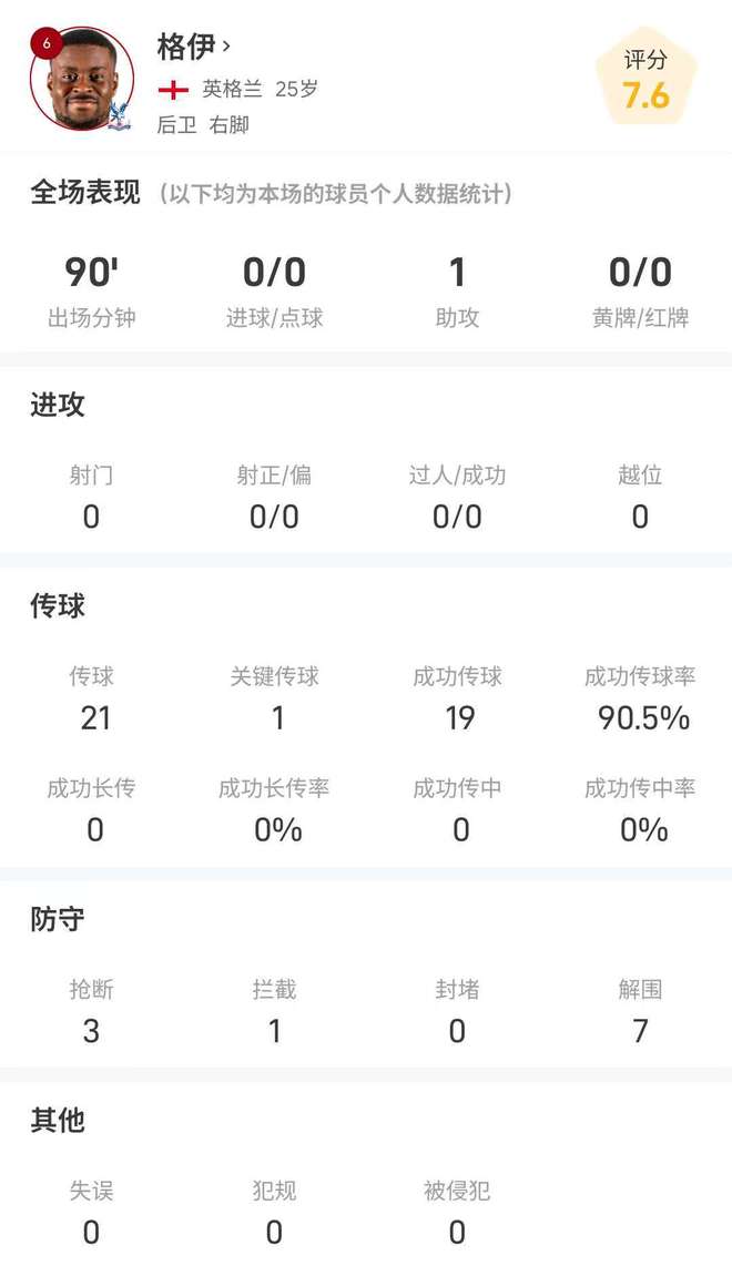 格伊全场数据如下: