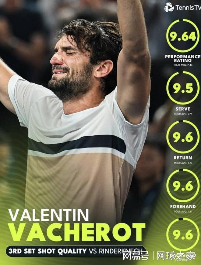 根据ATP统计数据,在职业网坛所有比赛中,能够全场保持四项基础击球质量指标均高于8.0的场次,仅占全部比赛的1%,这本身就已是精英选手的顶尖表现。而瓦舍罗在决赛的决胜盘中,发球、接发球、正手、反手四项数据竟然全部站上9.5分以上的恐怖高度,这种表现的出现概率,几乎如同在网球场地上发现一颗新星。