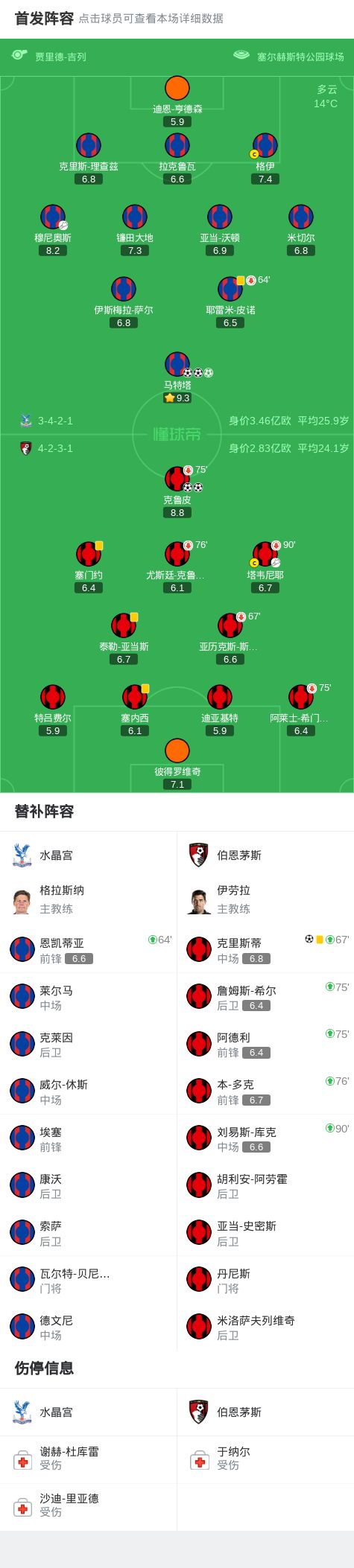 水晶宫33伯恩茅斯,马特塔帽子戏法,克鲁皮双响