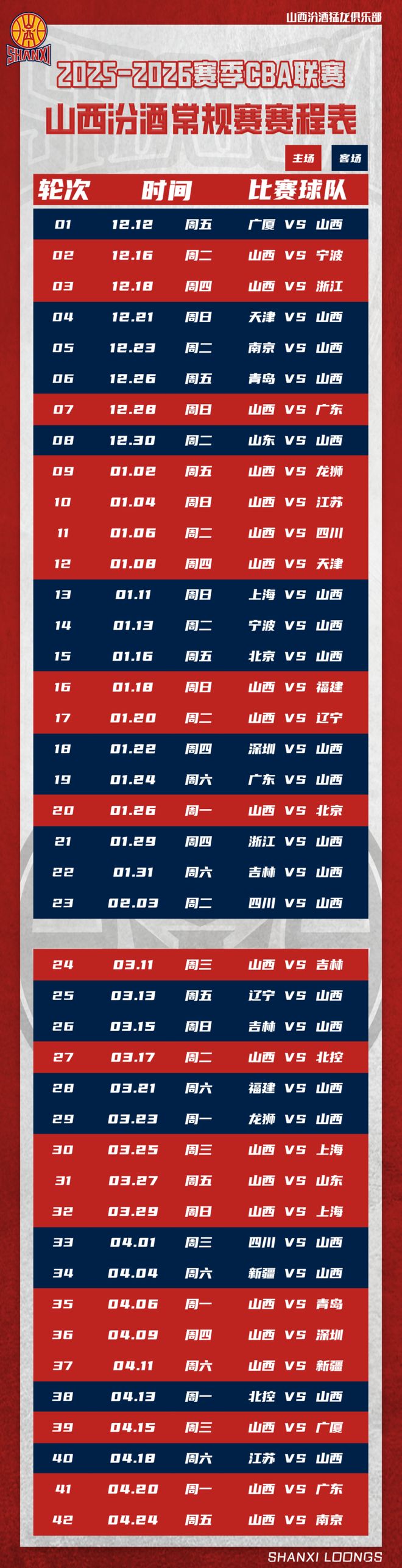 2025-2026赛季CBA联赛常规赛赛程正式公布。本赛季常规赛共42轮,12月12日,山西汾酒男篮迎来新赛季揭幕战,客场挑战浙江广厦。