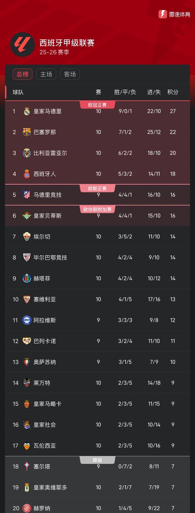 - 西甲 | 西甲积分榜:皇马拿下国家德比正面扩大优势,5分领跑积分榜!