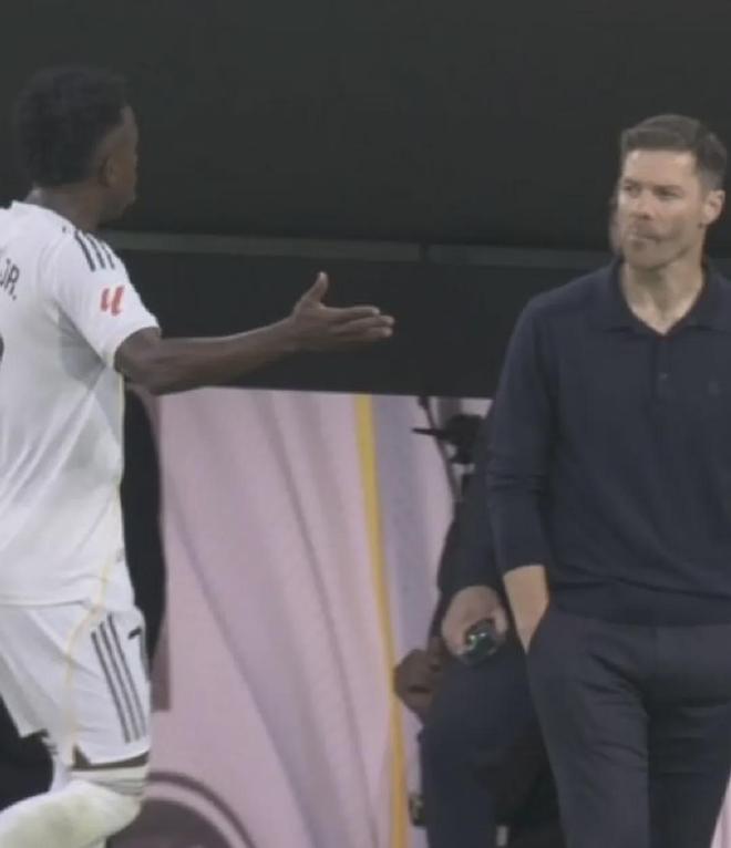在走向替补席途中,维尼修斯情绪失控,向阿隆索的决定做出抗拒手势,维尼修斯当时的惊呼清晰可闻,脸上写满难以置信。