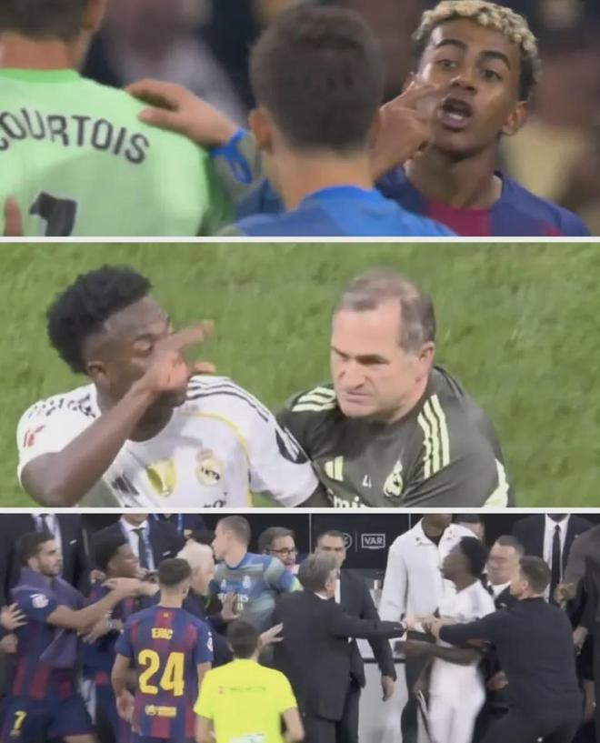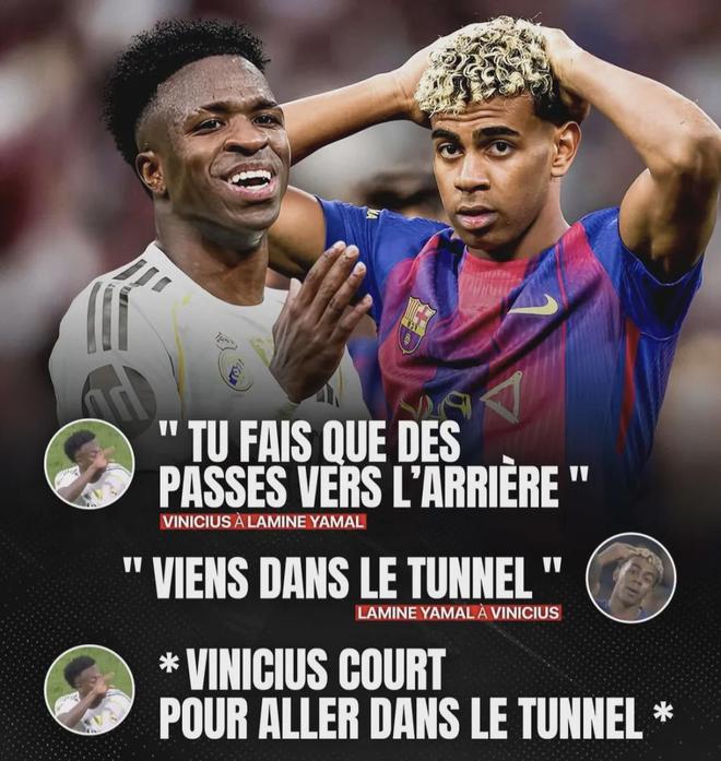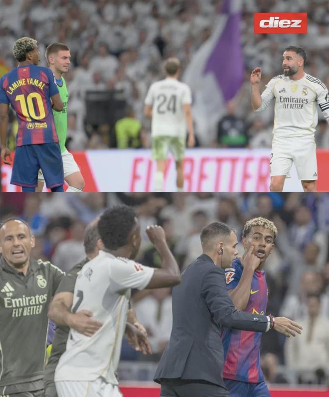 直到维尼修斯在回更衣室的路上和他迎面碰上,并做出一个嫌他话多的手势,亚马尔便约维尼修斯去更衣室“较量”,维尼修斯则边跑边回应并接受了挑战,但有人拦住了他。