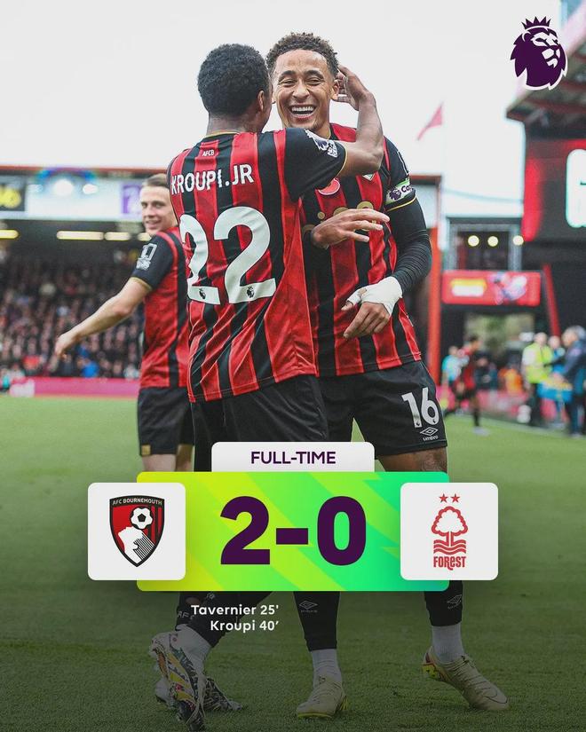英超第9轮,伯恩茅斯主场迎战诺丁汉森林。上半场,塔韦尼耶角球直接破门,克鲁皮远射破门,最终,伯恩茅斯在主场2球击败对手。
