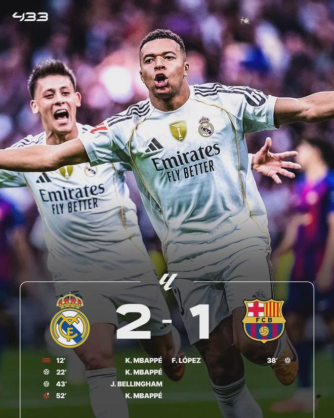 最终,皇马在主场2-1击败巴萨,赢下本赛季的首场国家德比。