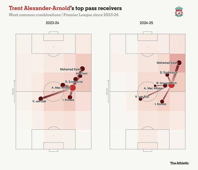 阿诺德快速沿边线传给萨拉赫的传球也是他的一大利器,本赛季也确实让人怀念。下图再次强调了他们之间的默契,并暗示右后卫的离队可能是埃及人本赛季开局相对缓慢的因素之一。