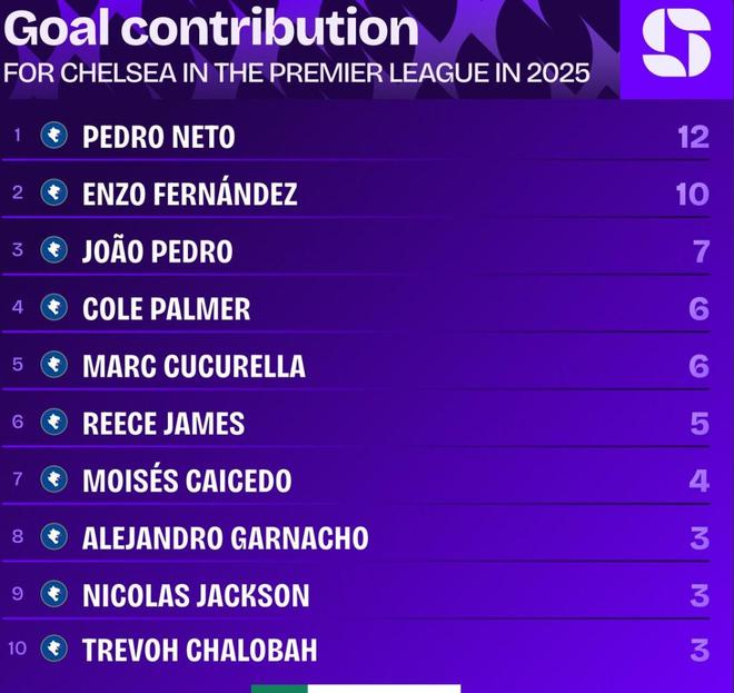 佩德罗内托2025年英超进球5+、助攻5+,是蓝军队内唯一一人