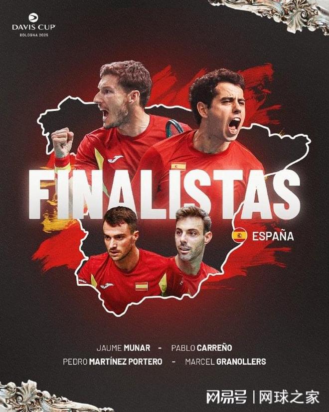 而西班牙队则是时隔6年再进戴维斯杯决赛,将与卫冕冠军意大利队争夺今年的冠军奖杯,三场的比分:布斯塔 6-4 7-6(6) 斯特鲁夫、穆纳尔 6-7(2) 6-7(5) 兹维列夫、格拉诺勒斯/马丁内斯 6-2 3-6 6-3 克拉维茨/普埃茨。尽管西班牙队和意大利队的第一主力阿尔卡拉斯和辛纳都没有参赛,但最终的决赛还是在这两个国家之间进行,只可惜球迷期盼的“阿辛决”无缘再次上演。