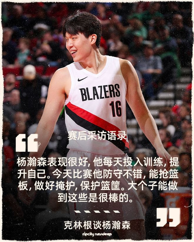 开拓者首发中锋克林根赛后在接受采访时表示,杨瀚森表现很好,每天都投入训练,提升自己,今天比赛杨瀚森防守不错,能抢篮板,做好掩护,保护篮筐。大个子能做到这些是很棒的。