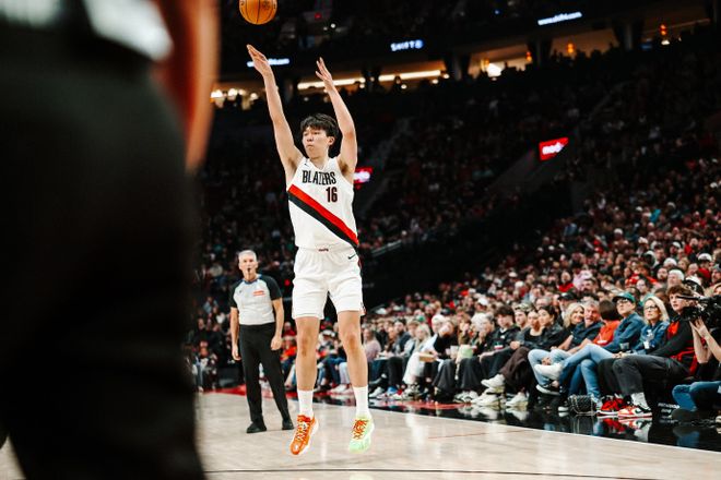 比赛第二节末段,杨瀚森在进攻时间仅剩3秒时接队友夏普传球,于右侧45度角面对防守强投命中压哨三分。这是他NBA生涯常规赛的第二记三分球(此前总计19投2中)。进球后,队友们都站起来给杨瀚森庆祝。