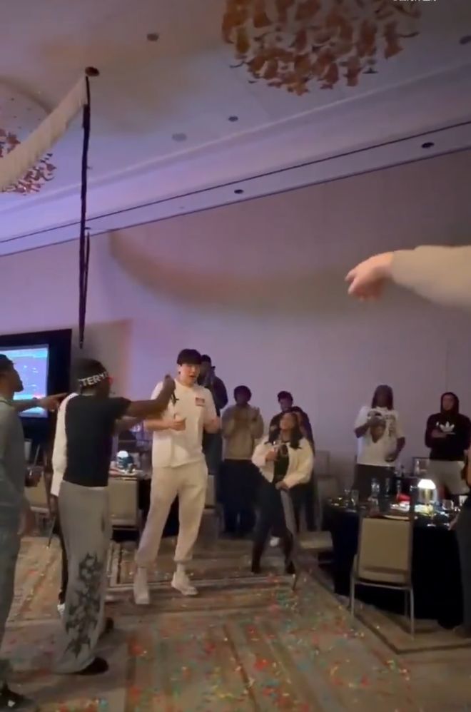 按照NBA的传统,新秀乐福领唱生日歌,杨瀚森同为新秀也在一旁跟着唱。
