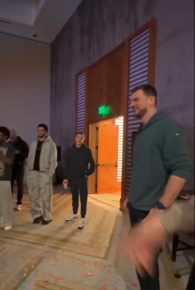 1月1日是斯普利特的41岁生日,开拓者全队在客场征途之中,也在下塔酒店的餐厅内集体为斯普利特庆生。