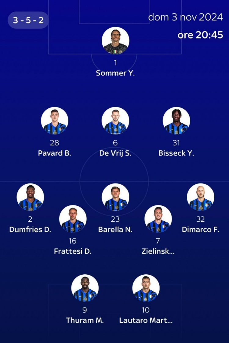 11月2日宣 下周一凌晨3:45,国米将在意甲中迎战威尼斯。赛前,意大利天空体育预测了国米本场比赛的首发阵容,其中,劳塔罗和图拉姆继续搭档锋线,巴雷拉、邓弗里斯、迪马尔科等人在列