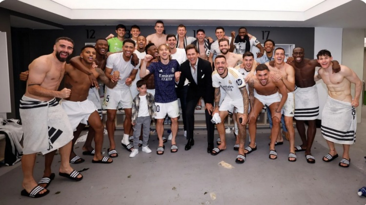 布雷迪与皇马全队更衣室合影,祝贺白衣军团赢下国家德比